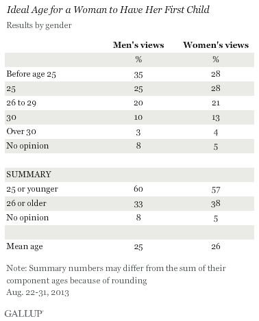 Πρόσφατη μεγάλη δημοσκόπηση της αμερικανικής ιστοσελίδας «Gallup» αποκαλύπτει ότι, όταν οι συμμετέχοντες ρωτήθηκαν σε ποια ηλικία θεωρούν ότι θα πρέπει οι γυναίκες να ξεκινούν τη διαδικασία σύλληψης, η πιο συνηθισμένη απάντηση ήταν «στα 25 τους χρόνια».