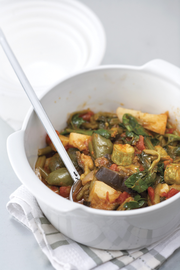 - Ρίχνουμε τα κολοκύθια, τα φασολάκια, τις πιπεριές, τις πατάτες, τα σέσκουλα και τις μελιτζάνες. Συνεχίζουμε το σοτάρισμα ανακατεύοντας συνεχώς για περίπου 10 λεπτά.