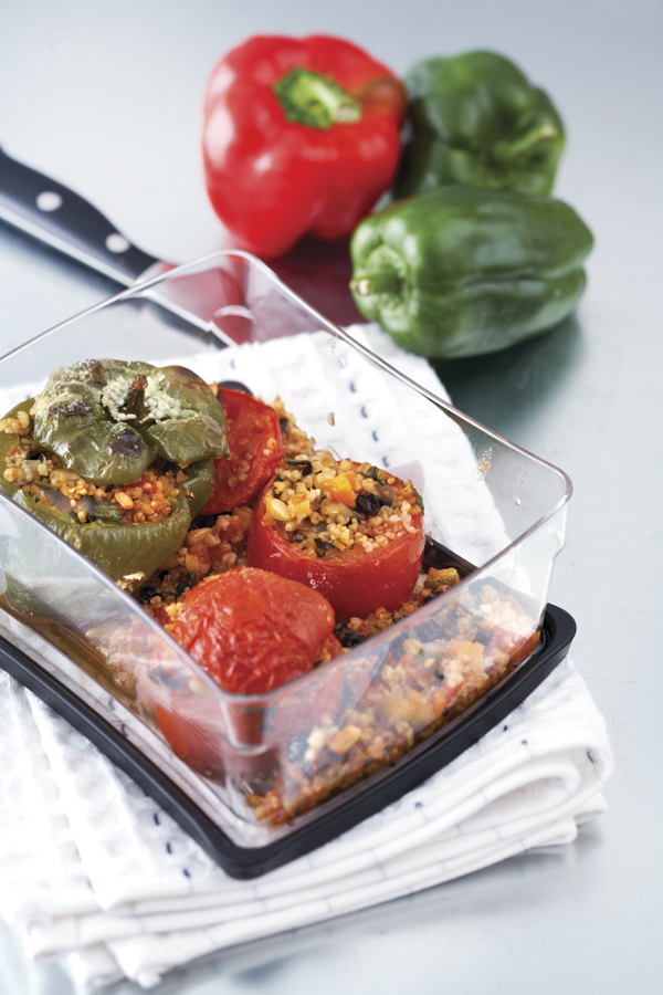 6. Κατεβάζουμε τη γέμιση από τη φωτιά και γεμίζουμε τις ντομάτες και τις πιπεριές. Η γέμιση δεν πρέπει να ξεπερνά τα 3/4 του εσωτερικού τους. Ραντίζουμε με το υπόλοιπο ελαιόλαδο, προσθέτουμε το χυμό της ντομάτας, αλατίζουμε ελαφρώς και ψήνουμε στο φούρνο μέχρι να «καεί» ελαφρώς η επιφάνεια των λαχανικών.