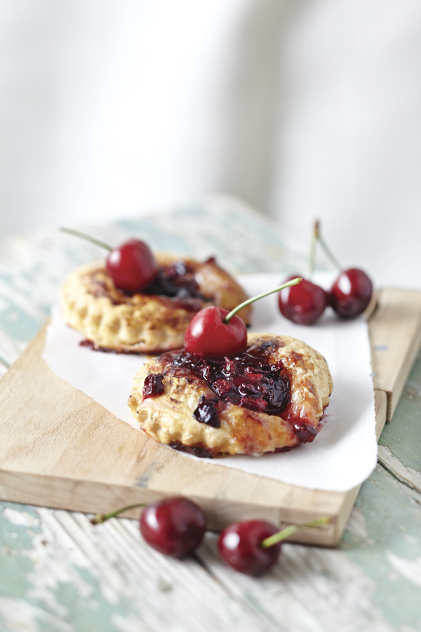 - Μοιράζουμε το μείγμα των κερασιών πάνω στα σφολιατάκια και ψήνουμε για 30 λεπτά.