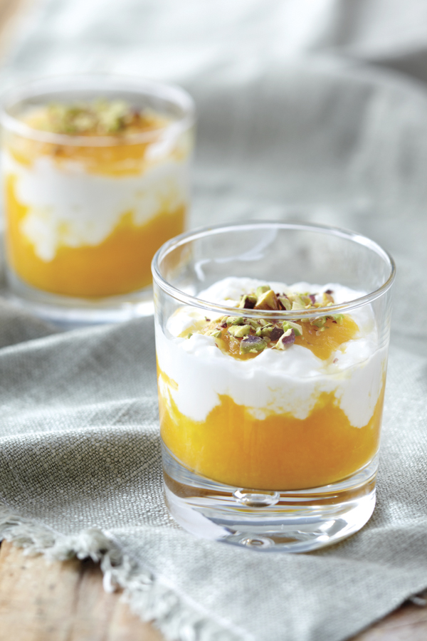 2. Μοιράζουμε σε ποτήρια του ουίσκι λίγο πουρέ βερίκοκου στον πάτο, από πάνω βάζουμε μία στρώση γιαούρτι, επαναλαμβάνουμε με μία στρώση βερίκοκο και τελειώνουμε με γιαούρτι. Πασπαλίζουμε με φιστίκια Αιγίνης και στολίζουμε προαιρετικά με τα φυλλαράκια δυόσμου.