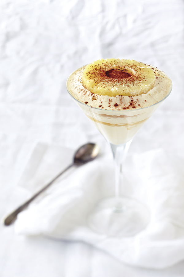 - Σε ποτήρια του ουίσκι, του μαρτίνι ή σε μπολάκια μοιράζουμε εναλλάξ σε στρώσεις φέτες ανανά, αφού προηγουμένως τις στραγγίσουμε, και λίγη κρέμα. Τελειώνουμε με 1 φέτα ανανά.