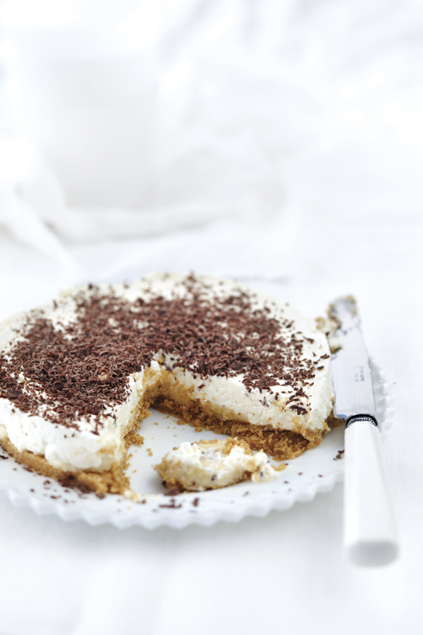 - Σε μία μετρίου μεγέθους ταρτιέρα στρώνουμε το μείγμα των μπισκότων ομοιόμορφα πιέζοντας με το χέρι μας.