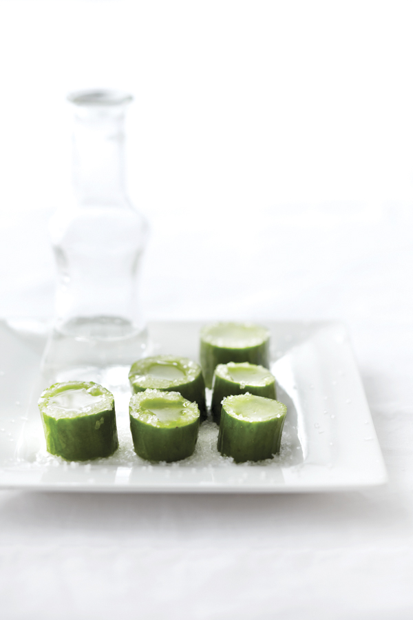 - Λίγη ώρα προτού σερβίρουμε, πασπαλίζουμε το εσωτερικό κάθε κούπας με λίγο χονδρό αλάτι και το γεμίζουμε με παγωμένη ρακή.