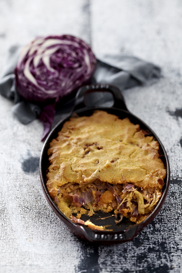 - Βουτυρώνουμε ένα ταψί και απλώνουμε στον πάτο του το χυλό του καλαμποκάλευρου. Πασπαλίζουμε με λίγο ωμό καλαμποκάλευρο και στρώνουμε ομοιόμορφα τη γέμιση με τα λάχανα.