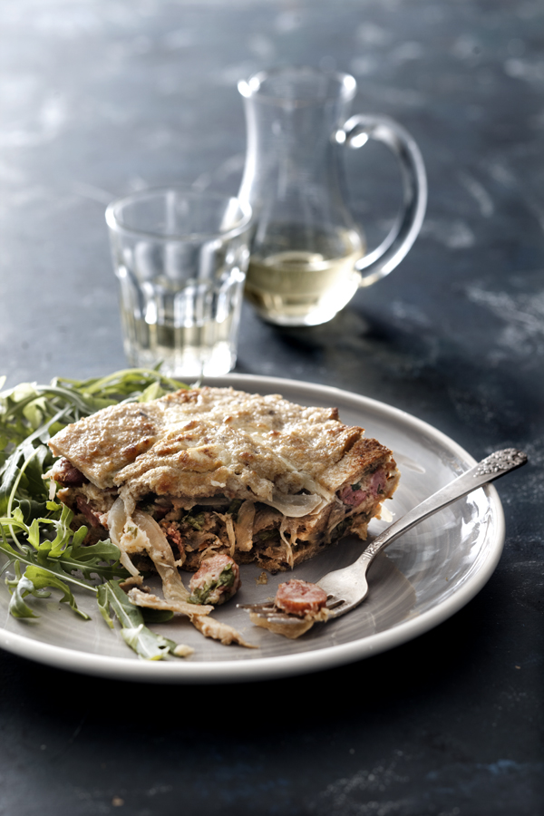 - Αλείφουμε ένα ταψί με τη μισή μαργαρίνη και το στρώνουμε με φέτες του τοστ. Απλώνουμε τη μισή γέμιση και σκεπάζουμε με άλλη μία στρώση ψωμί. Συνεχίζουμε με το υπόλοιπο της γέμισης, σκεπάζουμε πάλι με ψωμί και πασπαλίζουμε με το πεκορίνο.