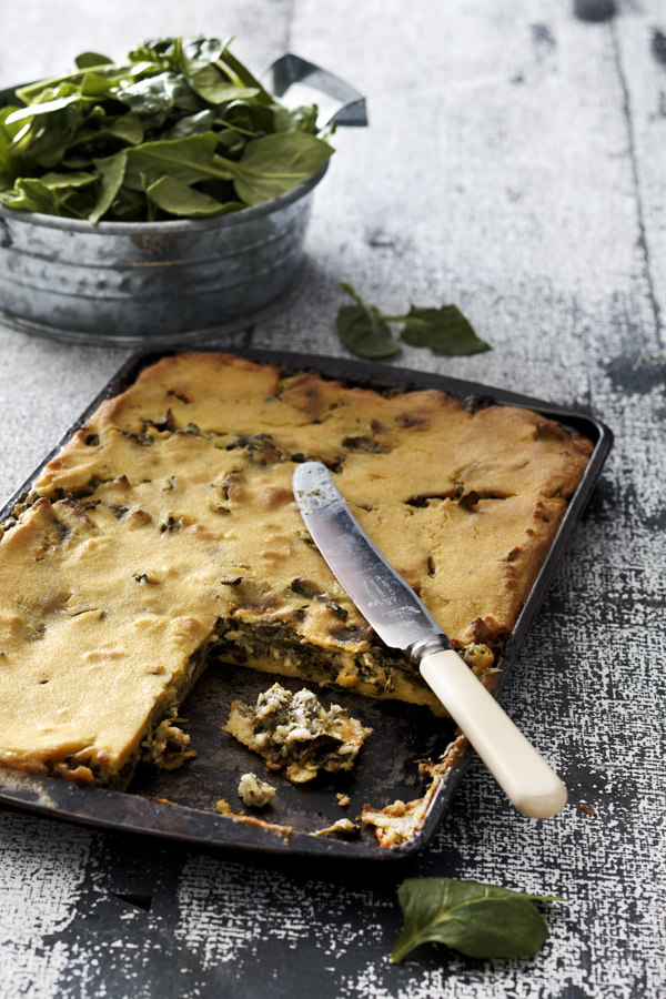 - Λαδώνουμε ένα ταψί ή το αλείφουμε με μισό ελαιόλαδο – μισό βούτυρο. Απλώνουμε μια πολύ λεπτή στρώση από το χυλό στον πάτο και από πάνω απλώνουμε ομοιόμορφα τα χόρτα. Σκεπάζουμε με ένα πολύ λεπτό στρώμα από το χυλό.