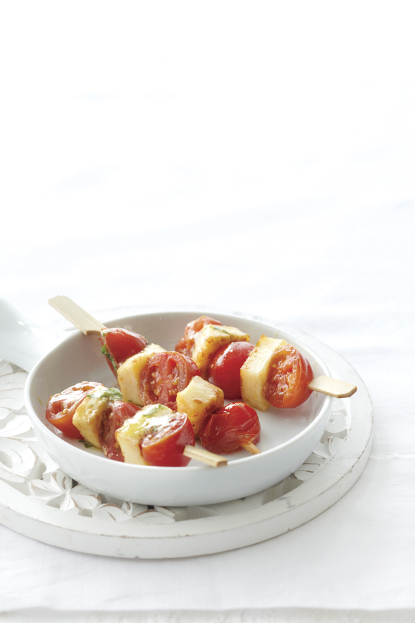 - Περνάμε σε κάθε καλαμάκι εναλλάξ μισό ντοματίνι και ένα κομματάκι τυρί. Κάθε σουβλάκι πρέπει να έχει τρία μισά ντοματίνια και δύο κομματάκια τυριού.