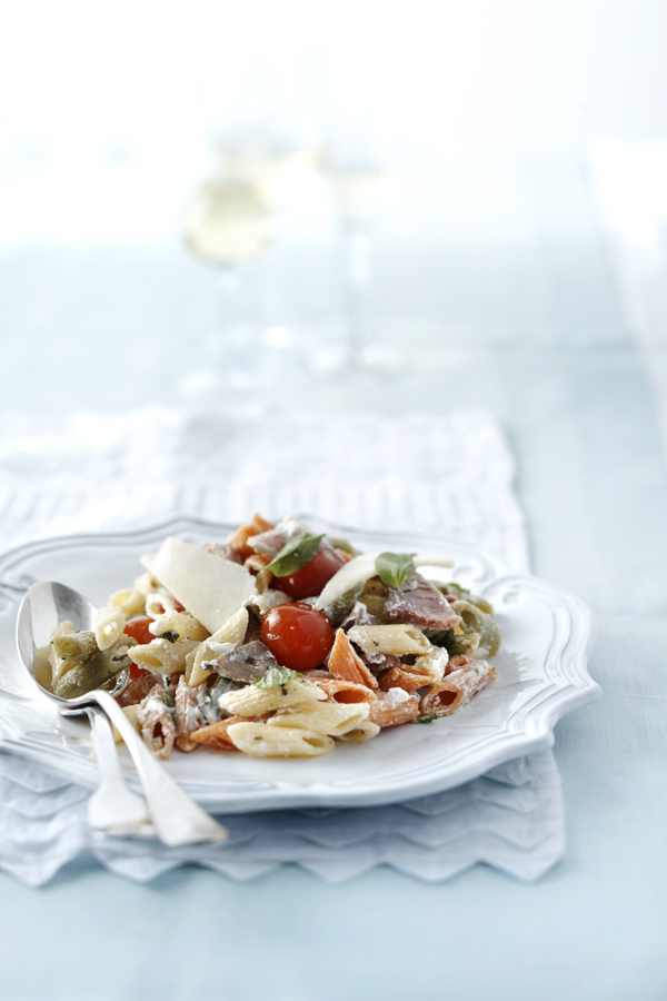 - Βράζουμε τα ζυμαρικά σύμφωνα με τις οδηγίες του πακέτου, ώστε να γίνουν al dente, περιχύνουμε με 2 κ.σ. ελαιόλαδο και τα αφήνουμε να κρυώσουν.