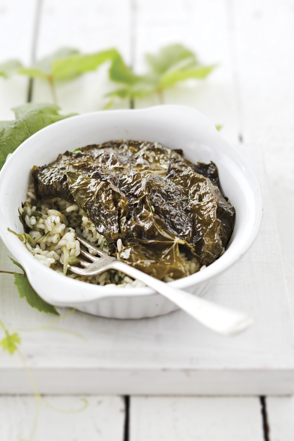 - Περιχύνουμε με το υπόλοιπο ελαιόλαδο, το χυμό λεμονιού και 4 φλιτζάνια νερό. Βάζουμε από πάνω ένα πιάτο για να μην ανοίξουν τα αμπελόφυλλα και ψήνουμε στο φούρνο για 35-40 λεπτά.