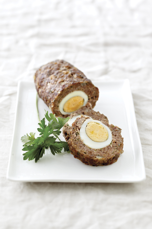 3. Σε μια αλευρωμένη επιφάνεια απλώνουμε τον κιμά σε παραλληλόγραμμο. Βάζουμε σε σειρά στο κέντρο τα βραστά αυγά και κλείνουμε τον κιμά σε ρολό, καλά, ώστε να μην ανοίξει. Η ένωση δεν θα πρέπει καν να διακρίνεται.