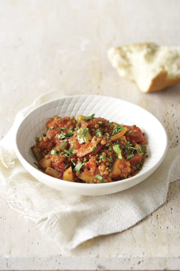 - Προσθέτουμε τις πατάτες, το κύμινο, την πάπρικα και το λουκάνικο και αφήνουμε στη φωτιά για άλλα 30 λεπτά ή μέχρι ή πατάτες και οι φακές να μαλακώσουν αρκετά.