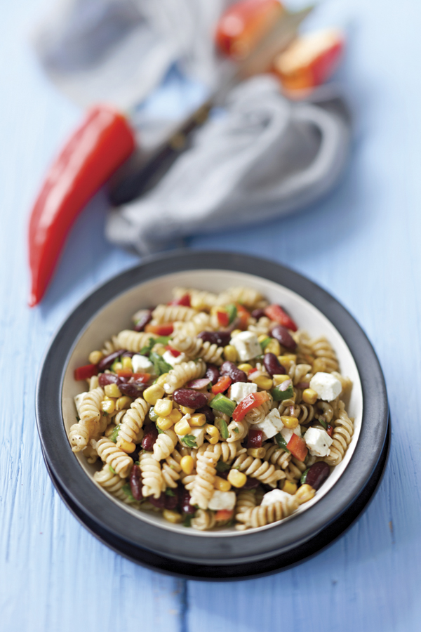 2. Σε ένα μεγάλο μπολ ανακατεύουμε το καλαμπόκι, το κρεμμύδι, τα φασόλια, το μαϊντανό, τις πιπεριές, τη φέτα και τα ζυμαρικά.