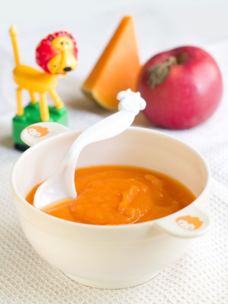 Εκτέλεση Κόβουμε το μήλο και τη γλυκοπατάτα σε μικρούς κύβους. Τα βράζουμε μέχρι να γίνουν μαλακά, αλλά προσέχουμε να μη τα παραβράσουμε. Τα βάζουμε στο μπλέντερ μαζί με λίγο ζεστό νερό.