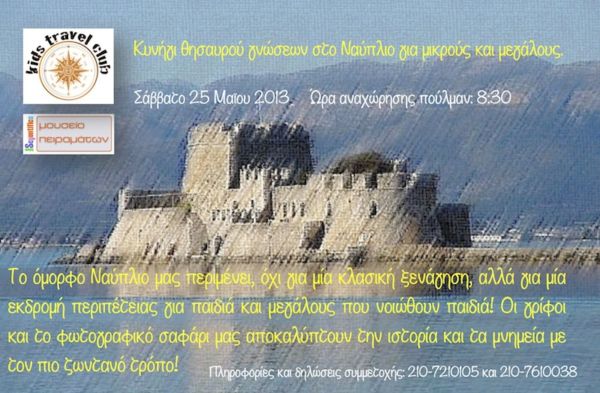 Η πρώτη πρωτεύουσα της Ελλάδας γίνεται το σκηνικό ενός παιχνιδιού γνώσης για μικρούς και μεγάλους. Λύνοντας τους γρίφους και παίρνοντας μέρος σε ένα φωτογραφικό σαφάρι, οι μικροί μας φίλοι ανακαλύπτουν μαζί με τους γονείς τους την ιστορία του Ναυπλίου και γνωρίζουν τα σημαντικότερα μνημεία του. Οι γραφικοί δρόμοι, οι πλατείες, τα αγάλματα και τα κτήρια της ιστορικής πόλης δίνουν τις απαντήσεις, αλλά η συνεργασία των ομάδων τις λύσεις σε ένα συναρπαστικό κυνήγι, όχι θησαυρού, αλλά γνώσεων! Αναχώρηση: Σάββατο 25 Μαΐου στις 8.30 το πρωί. 2. Καλοκαίρι στην Κωνσταντινούπολη με τα παιδιά και για τα παιδιά!