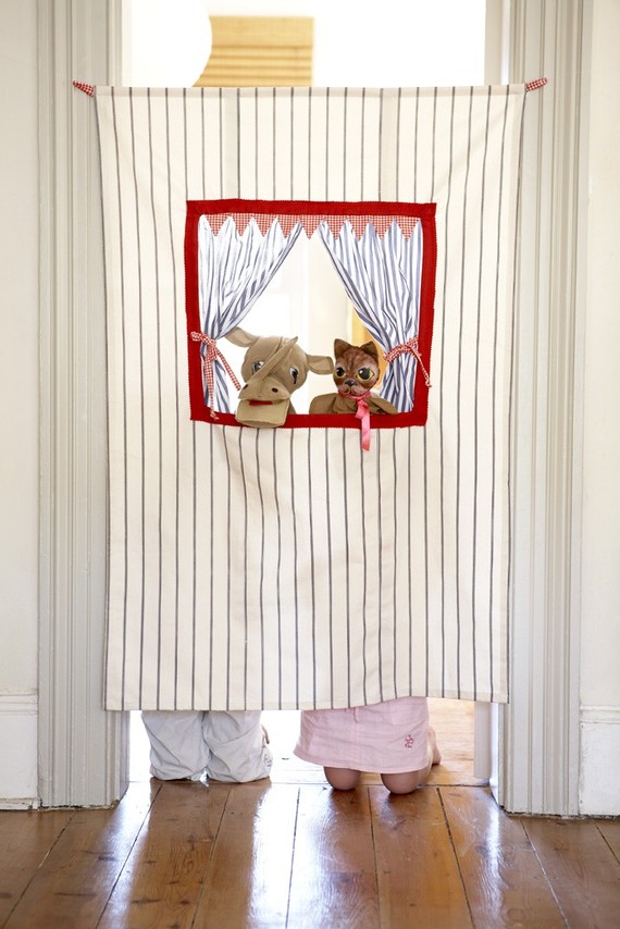 Το θέατρo για μαριονέτες και δακτυλόκουκλες είναι εύκολο να κατασκευαστεί και να κρεμαστεί σε μια πόρτα. Μπορείτε μάλιστα αντί να το κρεμάτε στις πλάγιες κάσες της πόρτας, με δυο κορδέλες να το τυλίγετε όταν τελειώνει η… παράσταση στο πάνω μέρος της κάσας της πόρτας. Την επόμενη φορά αυτό μόνο που θα κάνετε είναι λύσετε τις κορδέλες και έτοιμο το σκηνικό! Οι υπέροχες φωτογραφίες είναι από το CoolSpacesForKids