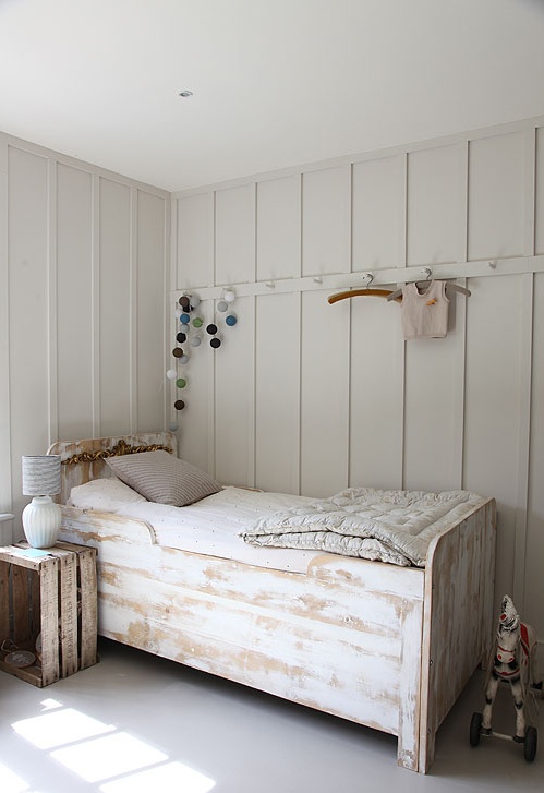 Αν αγαπάτε τις φυσικές αποχρώσεις και δεν θέλετε έντονα χρώματα και εντάσεις στην διακόσμηση του παιδικού δωματίου, η καλύτερη επιλογή είναι να διαλέξετε χρώματα σε αποχρώσεις του λευκού του γκρι και του μπεζ.  Σε αντίθεση με το αποτέλεσμα που θα είχε ένα λευκό πλακάκι η χρήση του βαμμένου σε λευκούς τόνους ξύλου φωτίζει το πάτωμα και τους τοίχους με μια πατίνα ζεστασιάς. Τα φυσικά υλικά προσδίδουν έναν χαλαρωτικό και ζεστό τόνο στον χώρο του παιδικού υπνοδωματίου.
