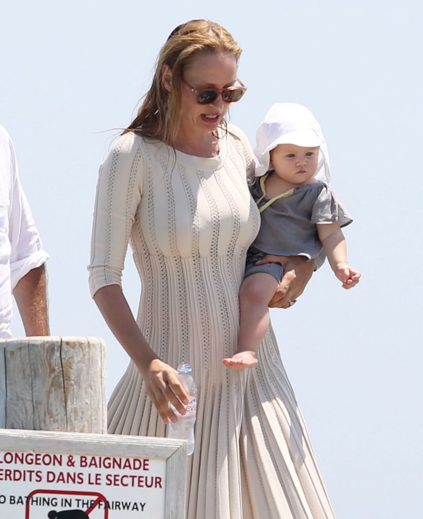 Είναι μια πανευτυχής μαμά, κι αυτό φαίνεται. Η 43χρονη ηθοποιός μάς συστήνει τη μόλις 1 έτους Ρόσαλιντ στο Σαντ Τροπέ, όπου περνάνε τις καλοκαιρινές τους διακοπές μαζί με την υπόλοιπη οικογένεια: τη 14χρονη Μάγια και το 10χρονο Λέβον, που είναι τα παιδιά από τον πρώτο της γάμο με το γνωστό ηθοποιό Ίθαν Χοκ. Μαζί τους είναι και ο νυν σύντροφός της και μπαμπάς της μικρής, ο βρετανός χρηματιστής Αρπάντ Μπουσσόν, ο οποίος έχει ακόμη δύο παιδιά από την προηγούμενη σχέση του με το τοπ μόντελ Ελ ΜακΦέρσον. Η Θέρμαν έδειχνε πολύ όμορφη μέσα στο λευκό Azzadine Alaia φόρεμά της, ενώ κρατούσε συνεχώς στην αγκαλιά της τη χαριτωμένη κορούλα της. (photos: x17agency, abacapress)