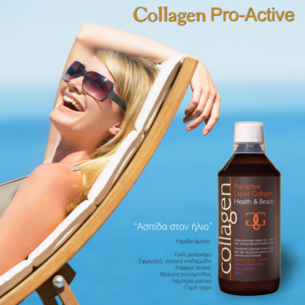Το Collagen Pro– Active είναι το ιδανικό συμπλήρωμα διατροφής, που λόγω της ιδιαίτερης σύνθεσής του, επιτρέπει να απορροφάται και να χρησιμοποιείται άμεσα το κολλαγόνο από τον οργανισμό μας. Αυτή είναι άλλωστε και η μεγαλύτερη ασπίδα που μπορούμε πλέον να χρησιμοποιήσουμε, ώστε να απολαμβάνουμε την ηλιοθεραπεία και ταυτόχρονα να είμαστε πλήρως προστατευμένοι.