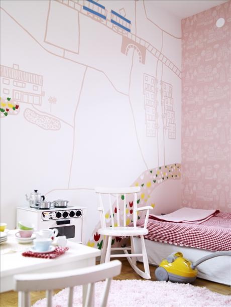 ΌΛΑ!. Η ροζ ταπετσαρία στον ένα τοίχο, η ζωγραφιά στον άλλο. Το στρωμένο tea time τραπέζι, η κουζίνα με τα κατσαρολάκια, η κουνιστή καρέκλα. Θέλω να σκουπίσω τώρα!