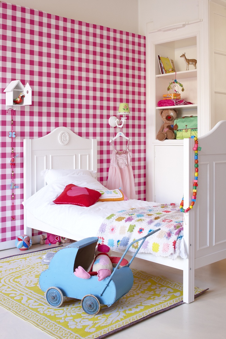 Η καρό ταπετσαρία. Ο τοίχος στο προσκέφαλο του κρεβατιού είναι το κυρίαρχο διακοσμητικό στοιχείο. Όσο για το περσικό χαλάκι «βγαίνει από αριστερά» και κλέβει την παράσταση!