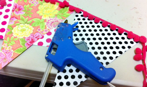 Βήμα 1: Μετρήστε την απόσταση που θέλετε να καλύψει η κορδέλα με τα σημαιάκια. Αποφασίστε το μέγεθος που θα κόψετε τα τρίγωνα. Βήμα 2: Αγοράστε από ένα βιβλιοχαρτοπωλείο μια ποικιλία από χρωματιστά χαρτιά. Η ποσότητα θα είναι ανάλογη των μέτρων που θέλετε να καλύψετε. Αν δεν έχετε ένα ψαλίδι που να κόβει ικανοποιητικά, αγοράστε ένα. Θα χρειαστείτε επίσης ένα κοπίδι, μια χρωματιστή κορδέλα ή μια υφασμάτινη τρέσα, ένα συρραπτικό και κόλλα σιλικόνης. Βήμα 3: Eφόσον έχετε αποφασίσει το μέγεθος των τριγώνων, σχεδιάστε ένα σε χοντρό χαρτονάκι. Θα είναι ο μπούσουλας για να κόψετε τα χαρτιά. Με ένα χάρακα κι ένα κοπίδι κόψτε το χαρτονάκι στο σχήμα του τριγώνου που έχετε σχεδιάσει. Βήμα 4: Πάνω σε μια επιφάνεια κοπής (δεν θέλετε να γεμίσετε το τραπέζι σας με χαρακιές) ακουμπήστε τα χρωματιστά φύλλα χαρτιού. Ανάλογα με το πάχος τους μπορείτε να τα κόβετε πέντε πέντε ή και παραπάνω. Βάλτε από πάνω το χοντρό χαρτονάκι, τον μπούσουλα όπως το λέω εγώ, και αρχίστε να κόβετε τα χαρτιά με το κοπίδι. ΠΡΟΣΟΧΗ! Αν δεν είστε εξοικειωμένες με την χρήση του κοπιδιού, χρησιμοποιήστε το νέο σας ψαλίδι. Θα αργήσετε λίγο παραπάνω να κόψετε τα χαρτιά αλλά δεν θα τραυματίσετε κάποιο δάχτυλο. Βήμα 5: Βάλτε στη σειρά κάθε τρίγωνο με την μικρή πλευρά σε ευθεία με τα υπόλοιπα τρίγωνα και αρχίστε να κολλάτε την τρέσα με την κόλλα σιλικόνης. Καλή επιτυχία!