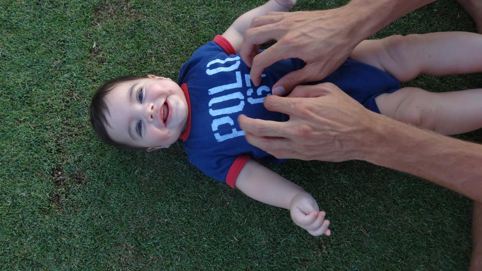 Η διαφορά είναι εμφανέστατη στο δεύτερο στιγμιότυπο, όπου ο μικρός είναι ξαπλωμένος στο γρασίδι και γελάει απολαμβάνοντας το γαργαλητό του μπαμπά του, του οποίου τα χέρια είναι στην κοιλίτσα του. Έτσι καταλαβαίνουμε και το σχετικό σχόλιο «μετά (τα παιχνίδια)… », που συνοδεύει τη φωτογραφία!