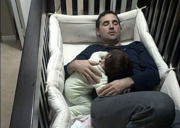 Παρόλο που οι παιδίατροι δεν το συνιστούν, όλοι γνωρίζουμε τα οφέλη όταν μοιράζουμε το κρεβάτι μας με το μωρό μας. Ευτυχισμένα και ήσυχα μωρά, ευτυχισμένοι και γαλήνιοι γονείς…ήσυχες βραδιές χωρίς ξενύχτια. Όμως, ας φροντίσουμε να το κάνουμε σωστά! Βέβαια, όταν έχεις να κάνεις με απελπισμένους μπαμπάδες, που το μόνο που θέλουν είναι να κοιμίσουν το μωρό τους αλλά να ηρεμήσουν και οι ίδιοι από τις φωνές και τα κλάματα του μωρού, τα αποτελέσματα ορισμένες φορές είναι πραγματικά τραγελαφικά και ενίοτε χαριτωμένα. Οφείλουμε να παραδεχτούμε ότι όταν οι μπαμπάδες είναι σε απόγνωση, διαθέτουν έμπνευση και μια παιδικότητα στην συμπεριφορά τους που καμιά φορά μπορεί να τους βάλει σε μπελάδες. Όπως ο μπαμπάς του βίντεο που θα παρακολουθήσετε. Πάντως για όλους τους μπαμπάδες που θα ήθελαν να ζήσουν ανάλογη εμπειρία, έχουμε μερικές συμβουλές που ίσως τους  φανούν χρήσιμες! 1. Ενισχύστε την κούνια του μωρού ώστε να μπορεί να αντέξει και το δικό σας βάρος. Αυτά τα πράγματα σίγουρα δεν είναι κατασκευασμένα για να κρατήσει έναν ενήλικα. 2. Προσπαθήστε το μωρό να κοιμηθεί δίπλα σας, και όχι πάνω σας χρησιμοποιώντας τον στήθος σας σαν στρώμα.   3. Αν δεν γίνει αυτό, δοκιμάστε να τοποθετήσετε πάνω στο στήθος σας μια μπλούζα (χωρίς να την φορέσετε). Με αυτόν τον τρόπο, όταν το μωρό κοιμηθεί, απλά σύρετε την  δίπλα σας σιγά σιγά μαζί με το μωρό για να «απεγκλωβιστείτε». 4. Σιγουρευτείτε ότι το μωρό έχει κοιμηθεί. Μην προσπαθήσετε να ξεφύγετε γρήγορα. 5. Και τώρα αρχίζουν οι επικίνδυνες αποστολές: Πως βγαίνετε από την κούνια χωρίς να ξυπνήσει το μωρό! Η μόνη λύση που βλέπουμε είναι να έχετε ήδη εγκαταστήσει ένα γερανό, με τηλεχειριστήριο για να μπορείτε να τον θέσετε σε λειτουργία μέσα από την κούνια. Ακόμα και αν είστε δεινός ορειβάτης και έχετε ανέβει στις πιο ψηλές κορυφές του κόσμου, εδώ δεν θα έχετε καμία τύχη. Όπως είδατε δεν υπάρχουν περιθώρια για ελιγμούς. 6. Και φυσικά ποτέ, μα ποτέ μην πείτε στη γυναίκα σας, την ιδέα που είχατε. Δεν νομίζουμε ότι τα ενθουσιαστεί! 7. Τελευταία συμβουλή και άκρως ουσιαστική: Απλά αστειευόμαστε! Πραγματικά μην επιχειρήσετε ποτέ κάτι τέτοιο. Απλά…ΜΗΝ!