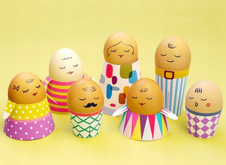Πάρτε πολύχρωμα χαρτιά, κόψτε τα για να κάνετε την βάση και τα χεράκια. Δοκιμάστε να τα τυλίξετε γύρω από τα αυγά (πριν κολλήσετε τις άκρες) για να βεβαιωθείτε ότι θα εφαρμόζουν καλά Κόψτε τα χεράκια, διπλώστε τα και τοποθετείστε τα όπως στην εικόνα, ή απλά κολλήστε τα.