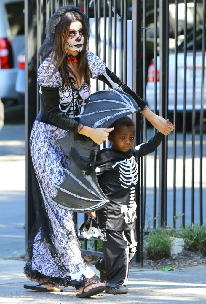 Μαμά και γιος κέρδισαν τις εντυπώσεις με τη μεταμφίεσή τους: Η Μπούλοκ ως πεπλοφόρος, με το πρόσωπό της μακιγιαρισμένο περίτεχνα στις αποχρώσεις του ασπρόμαυρου, και ο Λούις ως σκελετός, με την κατάμαυρη λιλιπούτεια στολή του. Ομολογουμένως, ήταν ένα πολύ ταιριαστό δίδυμο! (photos: x17agency)