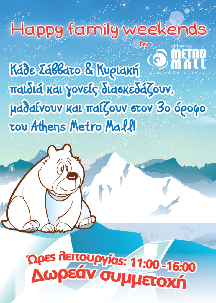 Τα Happy Family Weekends υποδέχονται παιδιά ηλικίας 3 έως 12 ετών κάθε Σάββατο και Κυριακή όλο τον Ιανουάριο* από τις 11.00 έως τις 16.00 με ελεύθερη είσοδο στον 3ο όροφο του Athens Metro Mall και υπόσχονται να τους χαρίσουν γνώση μέσα από διασκεδαστικές δραστηριότητες! Ο Ιανουάριος είναι ένας ακόμα μήνας διασκέδασης, γνώσης και χαράς για όλους!