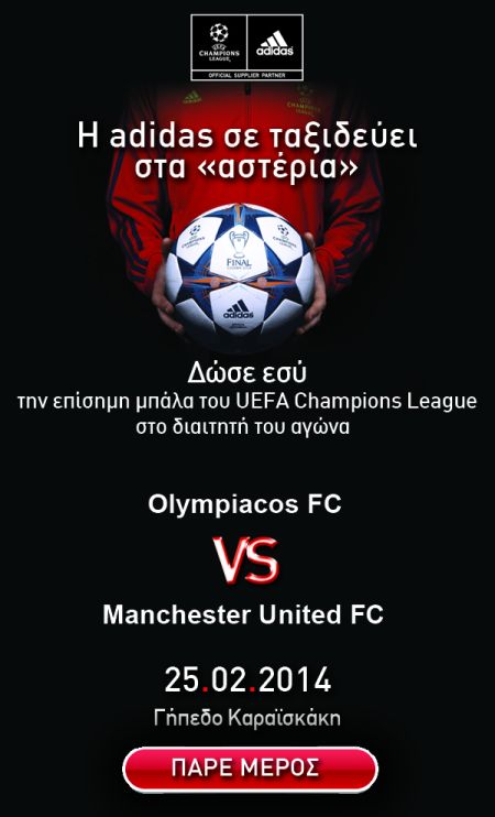 Αν είσαι μεταξύ 10 και 14 ετών, κάνε “κλικ” στο youngtalents.gr και ζήσε το όνειρο… …Χιλιάδες κόσμου στο γήπεδο, εκατομμύρια στην τηλεόραση, 2 τεράστιες ομάδες και… εσύ βγαίνεις από την φυσούνα μαζί με τους παίχτες ινδάλματά σου. Προχωράς στο κέντρο και δίνεις στον διαιτητή την μπάλα που σε λίγο θα κρίνει το αποτέλεσμα. Αυτό δεν είναι απλά μια στιγμή… είναι εμπειρία ζωής! Αν θέλεις να είσαι εσύ αυτός που θα ζήσει αυτή τη μαγική εμπειρία, η adidas, ως επίσημος χορηγός του UEFA Champions League, σου δίνει την ευκαιρία να κάνεις το όνειρό σου πραγματικότητα. Γίνε εσύ αυτός που θα δώσει στον διαιτητή την μπάλα του αγώνα Oλυμπιακός – Manchester United για το UEFA Champions League αυτή την Τρίτη στις 25 Φεβρουαρίου 2014 στο ιστορικό γήπεδο «Γεώργιος Καραϊσκάκης». Πως; Μα φυσικά με 3 απλά βήματα 1. Mπες στο Facebook page του youngtalents.gr 2. Πάτησε το tab Διαγωνισμός adidas 3. Απάντησε σε 2 απλές ερωτήσεις και στην συνέχεια συμπλήρωσε τα στοιχεία σου για να μπεις στην κλήρωση … και που ξέρεις…μπορεί να είσαι εσύ αυτός που θα βγει από την φυσούνα! Τόσο απλά, τόσο μοναδικά η adidas σου δίνει τον τρόπο και εσύ ζεις την στιγμή! Μην χάσεις την ευκαιρία!