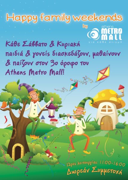 Τα Happy Family Weekends υποδέχονται παιδιά ηλικίας 3 έως 12 ετών κάθε Σάββατο και Κυριακή όλο τον Φεβρουάριο* από τις 11.00 έως τις 16.00 με ελεύθερη είσοδο στον 3ο όροφο του Athens Metro Mall και υπόσχονται να τους χαρίσουν γνώση μέσα από ατέλειωτο παιχνίδι, κέφι και διασκεδαστικές δραστηριότητες! Athens Metro Mall, Λεωφόρος Βουλιαγμένης 276, Άγιος Δημήτριος, Αθήνα, Τηλ.: 210 9769444, Ε-mail: info@athensmetromall.gr