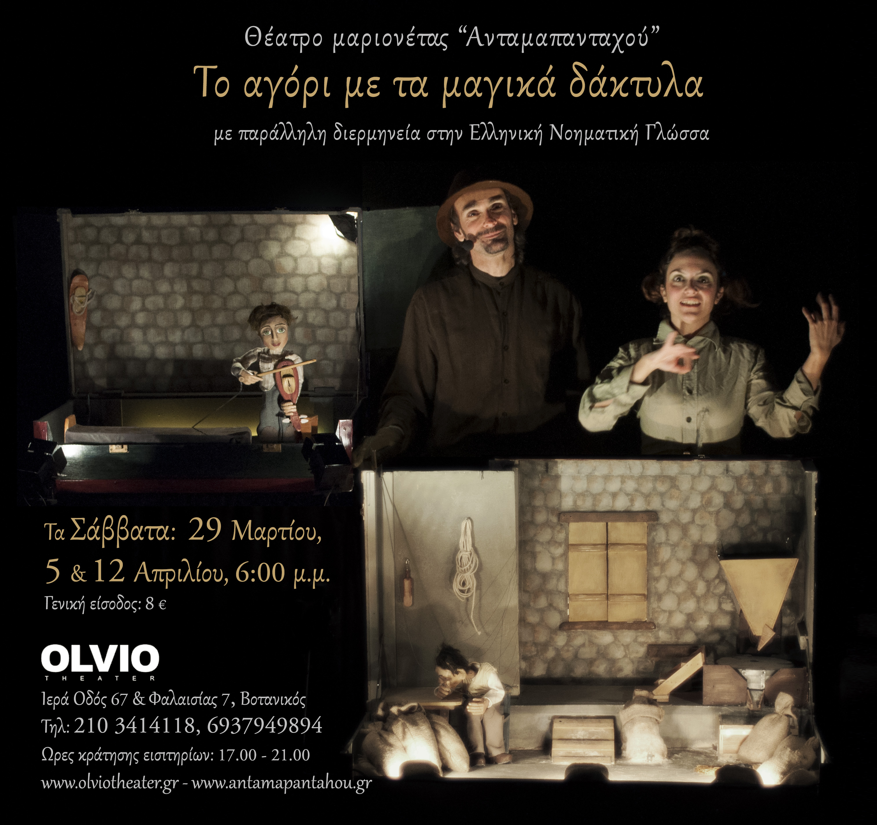 Πού χάνονται τα παιδικά μας όνειρα; Θα μπορέσει, άραγε, να μας δώσει κάποια απάντηση ο Στρατής, ο μικρός μυλωνάς με τη μεγάλη αγάπη για τη μουσική; Όταν το πάθος του Στρατή για το βιολί συγκρούεται με τα συμφέροντα του σκληρού αφέντη, το όνειρο και η πραγματικότητα μπλέκονται σ έναν χορό παράξενο, μαγικό και γνώριμο. Μια ιστορία για την ομορφιά της μουσικής και τη δύναμη της ανθρώπινης θέλησης. Πρόκειται για μια παράσταση θεάτρου μαριονέτας με κούκλες διαφορετικών μεγεθών και τεχνικών (μαριονέτες με νήματα και μαρότες), χρησιμοποιεί τεχνικές αφήγησης παραμυθιού και σύγχρονου θεάτρου σκιών ενώ ο σκηνικός χώρος μεταμορφώνεται διαρκώς κατά την εξέλιξη της δράσης. Η παράσταση γίνεται με παράλληλη διερμηνεία στην Ελληνική Νοηματική Γλώσσα με την τεχνική shadow interpretation. Η διερμηνέας-ηθοποιός έχει ρόλο και ακολουθεί τους ηθοποιούς-κουκλοπαίκτες στη σκηνή, γίνεται δηλαδή η «σκιά» τους. Με αυτό τον τρόπο αποφεύγεται η συνήθης βλεμματική καθυστέρηση των θεατών με προβλήματα ακοής, μία στον διερμηνέα στην άκρη της σκηνής, μία στον ηθοποιό στο κέντρο της σκηνής. Επιτυγχάνουμε, λοιπόν, την άμεση και ταυτόχρονη κατανόηση των ακουόντων θεατών και των θεατών με προβλήματα ακοής. Απευθύνεται σε παιδιά 4 ετών και άνω. Ημέρες και ώρες παραστάσεων: Τα Σάββατα 29 Μαρτίου, 5 & 12 Απριλίου 2014 στις 6:00 μ.μ. Είσοδος: 8€