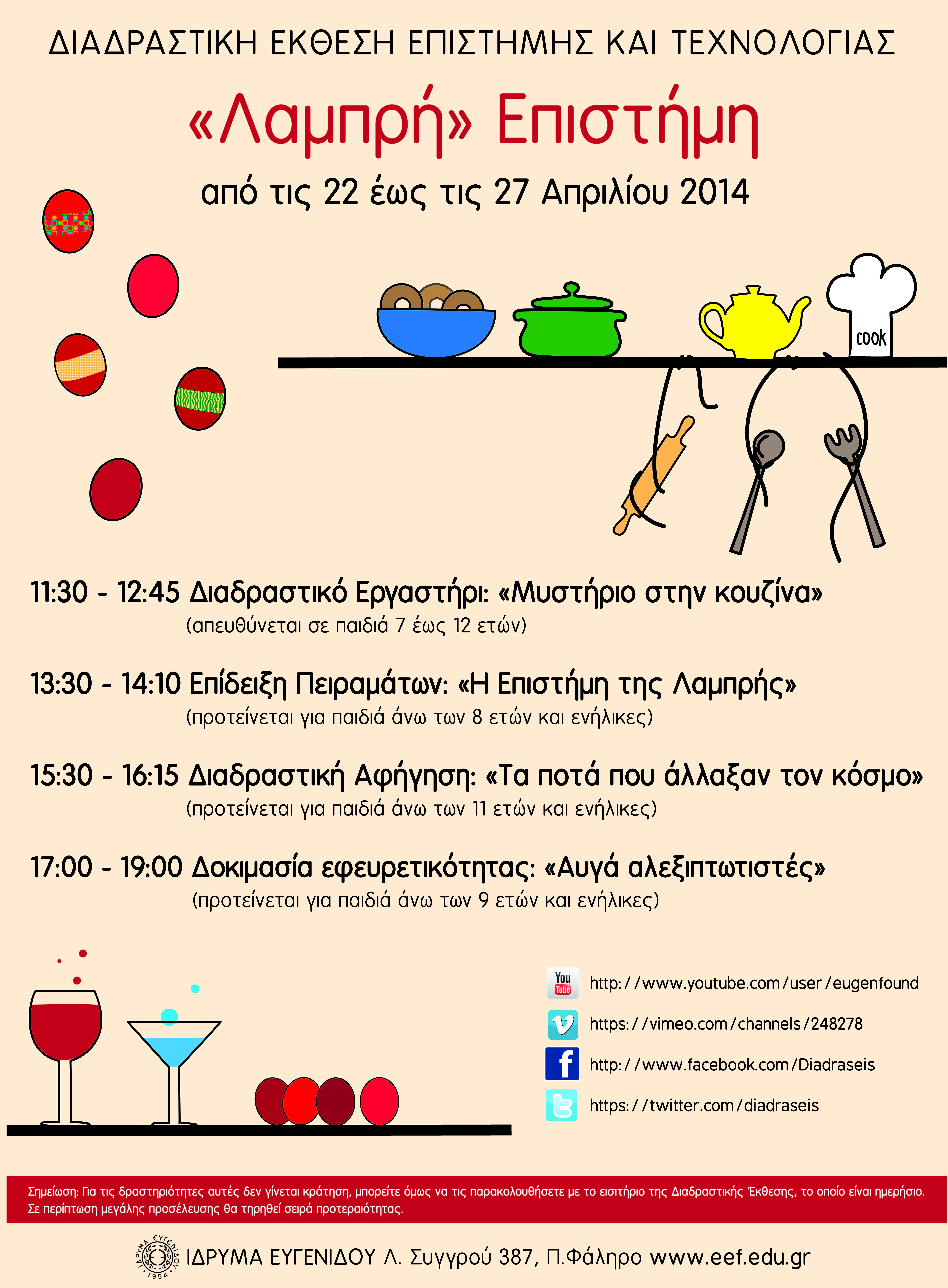 Η Διαδραστική Έκθεση Επιστήμης και Τεχνολογίας σάς προσκαλεί σε μία εορταστική ενότητα, στην οποία πρωταγωνιστούν τα κουλουράκια, τα ποτά, τα πυροτεχνήματα και τα αυγά! Στην ενότητα αυτή οι επισκέπτες, μεταξύ άλλων, θα λύσουν ένα γαστρονομικό μυστήριο χρησιμοποιώντας εξοπλισμό εργαστηρίου, θα μάθουν πού οφείλουν τα χρώματά τους τα πυροτεχνήματα, πόσο αντέχει το τσόφλι ενός αυγού, τι σχέση έχουν τα ποτά με την εξέλιξη της επιστήμης και την ιστορία της ανθρωπότητας και τέλος θα περάσουν μία δοκιμασία εφευρετικότητας. Από τις 22 έως τις 27 Απριλίου, το εορταστικό πρόγραμμα «Λαμπρή» Επιστήμη περιλαμβάνει: