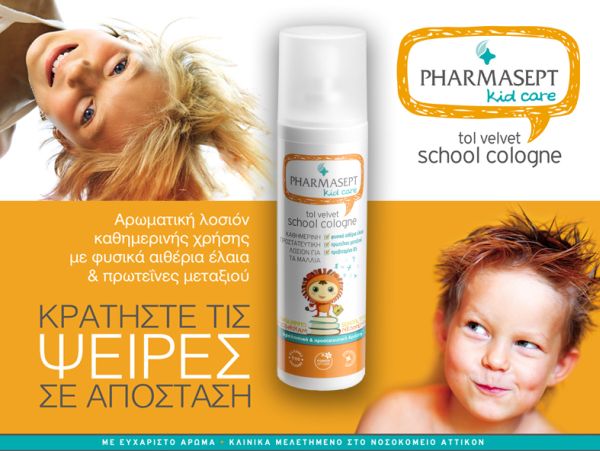Η Pharmasept παρουσιάζει τo Tol Velvet School Cologne, μία κλινικά μελετημένη αρωματική λοσιόν με φυσικά αιθέρια έλαια που προστατεύουν το τριχωτό της κεφαλής και πρωτεΐνες μεταξιού που περιποιούνται τα μαλλιά. Έχει ευχάριστο άρωμα, δεν χρειάζεται ξέβγαλμα και δεν λαδώνει τα μαλλιά.