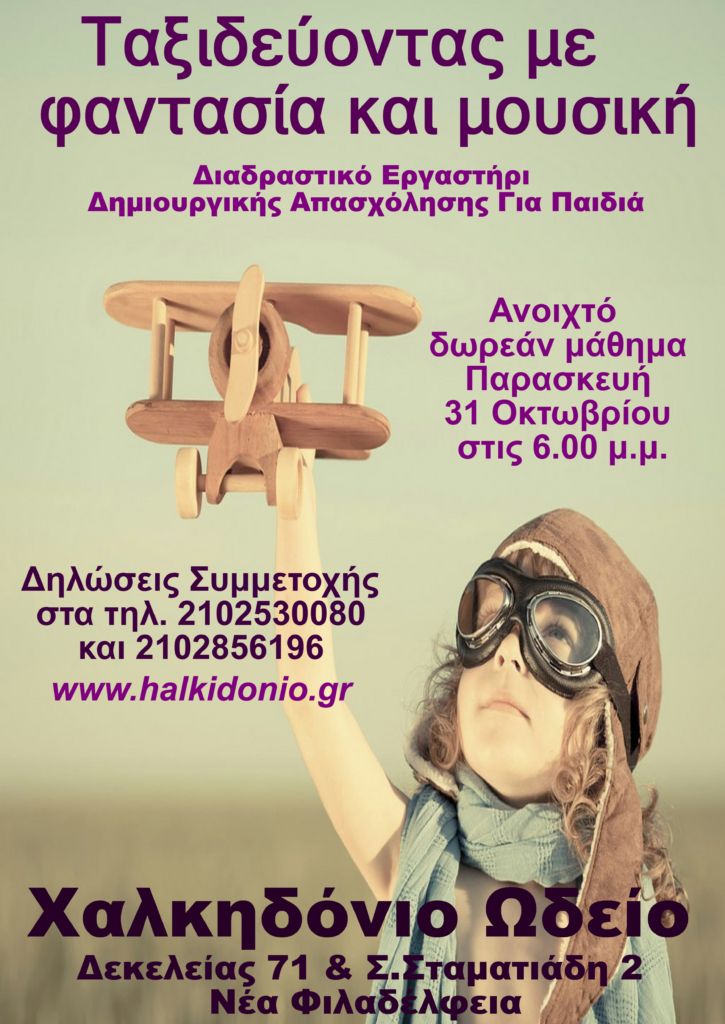 Με αποσκευές τη δημιουργικότητα, τη φαντασία, τη γνώση και τη διασκέδαση ταξιδεύουμε σε όλο τον κόσμο. Τα παιδιά ανακαλύπτουν διάσημα μνημεία, ξεχωριστές γεύσεις, μακρινές μουσικές και μοναδικές ιστορίες μέσα από το παιχνίδι και βιωματικές δραστηριότητες. Στόχος είναι τα παιδιά να έρθουν σε επαφή με διαφορετικούς πολιτισμούς και να δημιουργήσουν καινούργιες εμπειρίες, ενισχύοντας τη συνεργασία και την ενδυνάμωση των ικανοτήτων τους. Δωρεάν Ανοιχτό μάθημα την Παρασκευή 31 Οκτωβρίου στις 6.00 μ.μ. Χαλκηδόνιο Ωδείο, Δεκελείας 71& Σ. Σταματιάδη 2, Ν.Φιλαδέλφεια. Απαραίτητη η δήλωση συμμετοχής στα τηλ. 210 2530080 και 210 2856196. Περισσότερες πληροφορίες στο www.halkidonio.gr