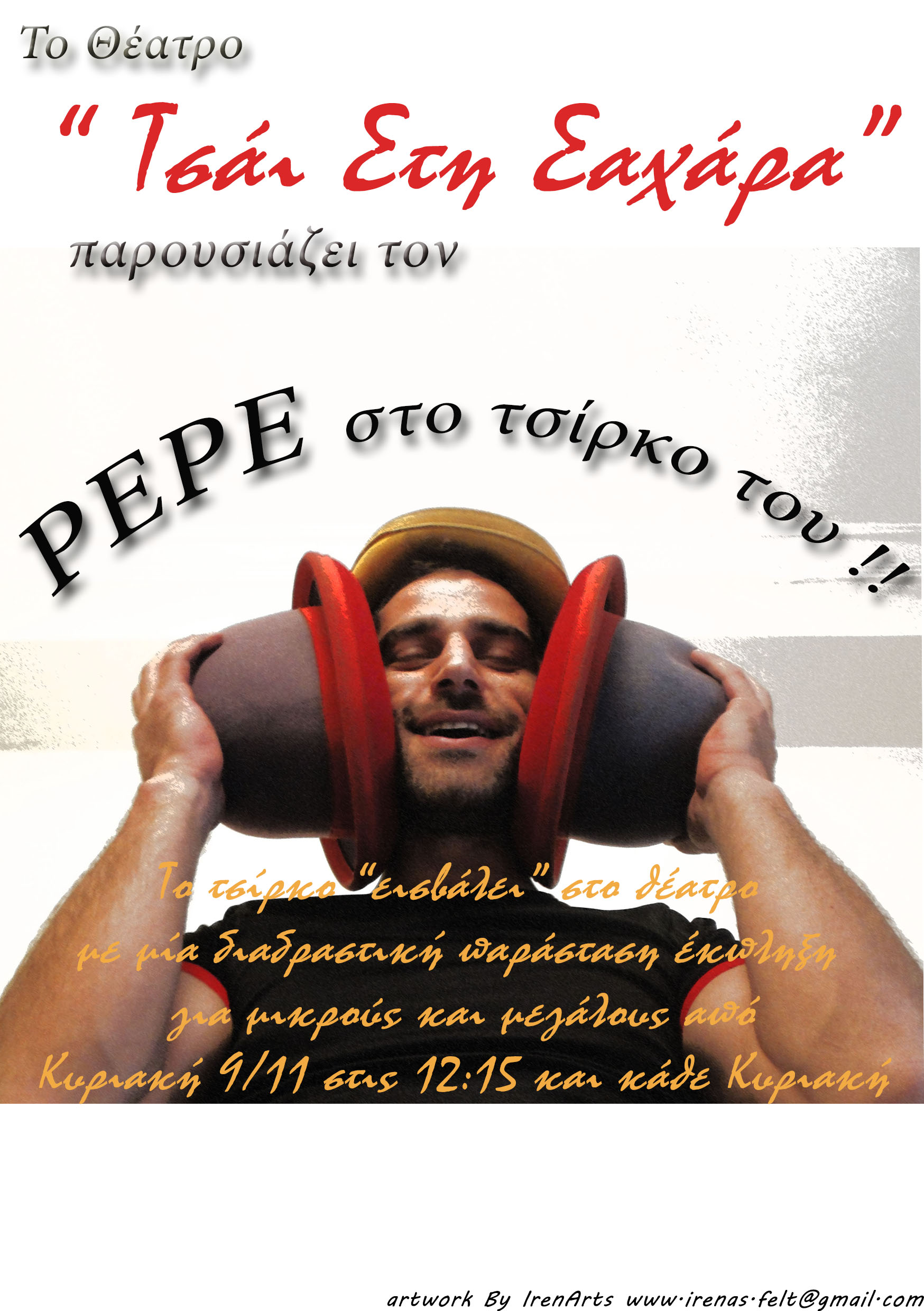 Το Τσίρκο «εισβάλει» στο θέατρο, κατεβαίνει κάτω από τη σκηνή, αφήνει στο καμαρίνι το «κοστούμι» και κοιτάει το κοινό στα μάτια! Ελάτε, μικροί, μεγάλοι, να διασκεδάσετε με μια διαδραστική παράσταση τσίρκο, με τον μοναδικό ζογκλέρ και ακροβάτη Pepe Peperonius. Παραστάσεις κάθε Κυριακή στις 12:15 (από την Κυριακή 9 Νοεμβρίου 2014). Τιμή εισιτηρίου: 7 ευρώ (γενική είσοδος). Τσάι στη Σαχάρα, Λαοδικείας 18, Ιλίσια, τηλ.: 2110-120936.