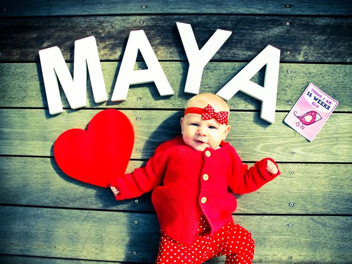 «Γεια σας! Το όνομά μου είναι Μάγια και η μαμά μου αποφάσισε να με φωτογραφίζει μία φορά την εβδομάδα. Μερικές φορές έχει πλάκα, άλλες πάλι χρειάζεται μεγάλη προσπάθεια! Εύχομαι να σας αρέσει η δουλειά μας, γιατί σκοπεύουμε να τη συνεχίσουμε για όλο τον 1ο χρόνο της ζωής μου!».