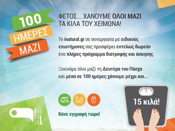 Ένα μοναδικό πρόγραμμα ανακοινώθηκε σήμερα: Το inatural σε συνεργασία με εξειδικευμένους επιστήμονες ετοίμασε το πρόγραμμα «100 Ημέρες Μαζί». Ένα ειδικά διαμορφωμένο πρόγραμμα που διατίθεται δωρεάν, ξεκινά 13 Απριλίου και ολοκληρώνεται στις 19 Ιουλίου. Στόχος του είναι να σας βοηθήσει να χάσετε σίγουρα και με ασφάλεια όλα τα παραπανίσια κιλά του χειμώνα, όπου και εάν βρίσκονται!
