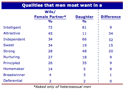 Για τις ανάγκες της έρευνας, οι ειδικοί ρώτησαν τους συμμετέχοντες ποια είναι τα τρία πρώτα στοιχεία που θέλουν να έχει η σύζυγος ή σύντροφός τους μεν, αλλά και η κόρη τους δε. Τι απάντησαν, λοιπόν, οι άντρες του 21ου αιώνα; Η «εξυπνάδα» είναι το Νο1 στις προτιμήσεις τους και για τις δύο περιπτώσεις.