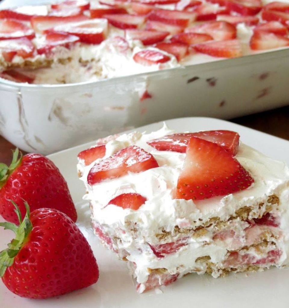 Υλικά 500 γραμμάρια φράουλες 600 ml κρέμα γάλακτος 3 κουταλιές της σούπας ζάχαρη άχνη 1 βανίλια (σκόνη) 1 πακέτο μπισκότα τύπου Petit beurre Εκτέλεση Πλύνετε τις φράουλες και κόψτε τις σε λεπτές φέτες, αφήνοντας στην άκρη μερικές που θα τις χρησιμοποιήσετε για γαρνιτούρα. Με ένα μίξερ χειρός χτυπήστε τη κρέμα γάλακτος. Προσθέστε την άχνη και τη βανίλια και και ανακατέψτε μέχρι να ενωθούν τα υλικά. Σε ένα πυρέξ (ή πιατέλα) βάλτε μία μικρή κουταλιά σαντιγί και κατόπιν τοποθετήστε από πάνω έξι μπισκότα. Καλύψτε τα με μία στρώση σαντιγί και στη συνέχεια απλώστε ένα στρώμα από τις φράουλες. Συνεχίστε για δύο φορές μέχρι να έχετε τρεις στρώσεις από μπισκότα. Καλύψτε το τελευταίο στρώμα με σαντιγί και προσθέστε μερικές φράουλες. Τοποθετήστε το γλυκό στο ψυγείο για τουλάχιστον 4 ώρες μέχρι να μαλακώσουν τα μπισκότα. Σερβίρετε με επιπλέον φράουλες και αν θέλετε με σος σοκολάτας.