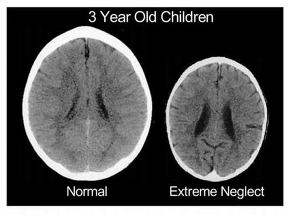 Μια πολύ ενδιαφέρουσα απεικόνιση του εγκεφάλου, δείχνει με αδιαμφισβήτητο τρόπο το μέγεθος της βλάβης που προκαλεί σε ένα μωρό η στέρηση της αγάπης από τη μητέρα του, όπως μας επιβεβαιώνει πρόσφατη αμερικανική έρευνα του Πανεπιστημίου της Καλιφόρνιας στο Λος Άντζελες (UCLA), η οποία και δημοσιεύθηκε στην Daily Telegraph. Οι επιστήμονες συνέκριναν τις εικόνες δύο παιδιών τριών ετών. Το πρώτο που απολάμβανε την αγάπη και τη συναισθηματική φροντίδα της μητέρας του, είχε έναν κανονικά ανεπτυγμένο εγκέφαλο για την ηλικία του. Το δεύτερο είχε μητέρα που αδιαφορούσε ή το κακομεταχειριζόταν. Ο εγκέφαλος του παιδιού που δεν λάμβανε την απαραίτητη φροντίδα ήταν κατά πολύ μικρότερος από ό,τι θα αναμενόταν στην ηλικία του, με πολύ πιο σκουρόχρωμες περιοχές και σκοτεινά σημεία από ό,τι ο εγκέφαλος του άλλου παιδιού. Ποιες είναι οι επιπτώσεις στη μετέπειτα ζωή των νηπίων αυτών; Το παιδί με τον κανονικό εγκέφαλο θα γίνει πιο έξυπνο, το πιθανότερο είναι να αναπτύξει την ικανότητα συναισθηματικής κατανόησης και ως επακόλουθο τη δυνατότητα εκδήλωσης συμπόνιας προς έναν συνάνθρωπό του, κάτι που καθορίζεται από συγκεκριμένη περιοχή του εγκεφάλου. Αντίθετα, το παιδί με τον μικρό εγκέφαλο έχει περισσότερες πιθανότητες ως ενήλικος να έχει τάση προς τη τοξικομανία, να διαπράξει βίαια εγκλήματα, ενώ μπορεί να αναπτύξει ψυχολογικά και άλλα σοβαρά προβλήματα υγείας. H σωστή μεταχείριση στα δύο πρώτα χρόνια της ζωής ενός μωρού, μπορεί να έχει σοβαρές επιπτώσεις στην ανάπτυξή του, εξηγεί ο καθηγητής Άλαν Σκόρι από το UCLA, καθώς τα γονίδια που ευθύνονται για αρκετές εγκεφαλικές λειτουργίες, όπως η ευφυΐα, δεν μπορούν να αποδώσουν. Μάλιστα, πολλά από αυτά ίσως δεν αναπτυχθούν ποτέ, ως επακόλουθο.