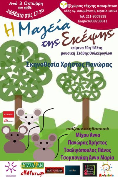 Από τις 3 Οκτωβρίου 2015 και κάθε Σάββατο στις 17.30, η παιδική θεατρική παράσταση «Η Μαγεία της Σκέψης» περιμένει μικρούς και μεγάλους στο «Χώρο Τέχνης Ασωμάτων» στο Θησείο. Μέρος των εσόδων της παράστασης θα διατεθεί για την ενίσχυση της δράσης των «Γιατρών Χωρίς Σύνορα».