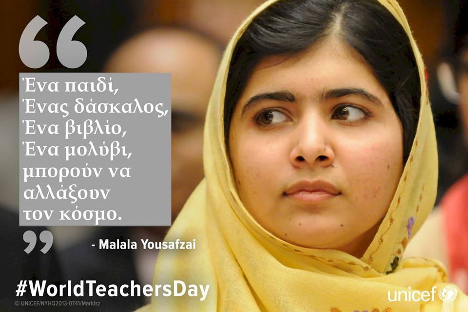 Σχεδόν 3 χρόνια μετά τον πυροβολισμό που δέχτηκε από τους Ταλιμπάν, η τότε μαθήτρια και νυν ακτιβίστρια Malala Yousafzai ζητά από τον ΟΗΕ να βοηθήσει όσο το δυνατόν περισσότερα παιδιά να έχουν δικαίωμα στην εκπαίδευση. Με το σλόγκαν «Ενδυναμώστε τους εκπαιδευτικούς, για να οικοδομήσουμε βιώσιμες κοινωνίες», καλεί τους ηγέτες του κόσμου να συνδράμουν προς αυτό το σκοπό.