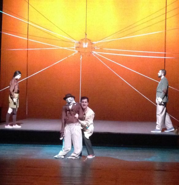 Ένας τεράστιος ήλιος δεσπόζει στη σκηνή, οι ακτίνες του απλώνονται σε όλη την οροφή και το θέατρο μεταμορφώνεται σε ένα τεράστιο χωράφι, σε ένα τεράστιο κομμάτι γης.