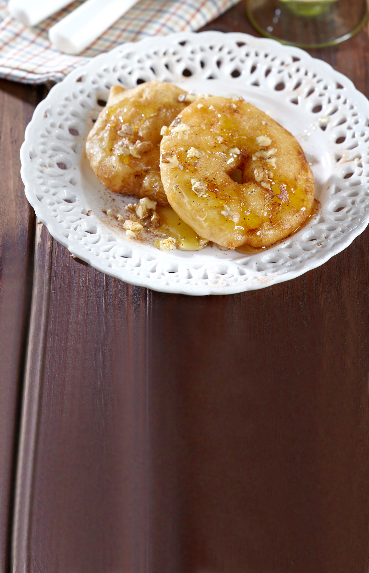 Αφαιρούμε τα κουκούτσια και το κοτσάνι από τα μήλα με το ειδικό εργαλείο κι έπειτα τα καθαρίζουμε προσεκτικά από τη φλούδα τους. Τα κόβουμε οριζόντια σε ροδέλες πάχους μισού εκατοστού (θα έχουν την τρύπα στη μέση) και τις βάζουμε σε ένα μπολ. Τις περιχύνουμε με το χυμό του λεμονιού για να μην μαυρίσουν.