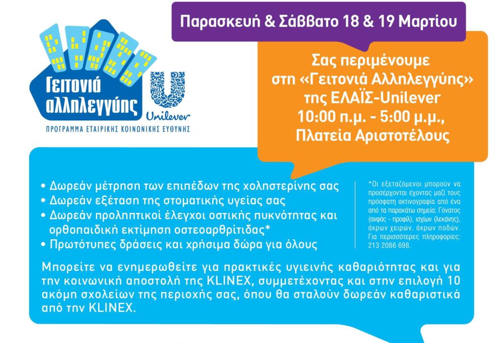 Ανοιχτή πρόσκληση σε όλους τους κατοίκους της Θεσσαλονίκης απευθύνει η ΕΛΑΪΣ-Unilever Hellas, για να επισκεφθούν τη «Γειτονιά Αλληλεγγύης» που, για δεύτερη χρονιά φέτος, θα πραγματοποιηθεί την Παρασκευή 18 και το Σάββατο 19 Μαρτίου, στην Πλατεία Αριστοτέλους, υπό την αιγίδα του Δήμου Θεσσαλονίκης.