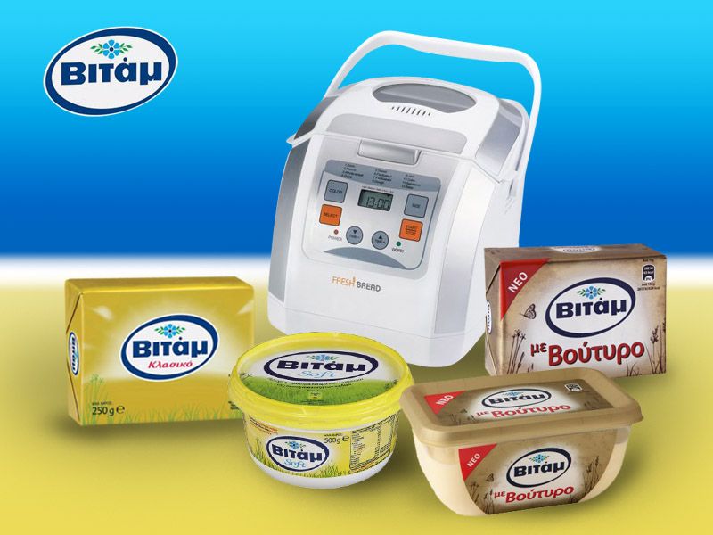 * 2 Βιτάμ soft 500g , 2 Βιτάμ πλακάκια, 1 Βιτάμ με Βούτυρο 400γρ και 2 Βιτάμ με Βούτυρο πλακάκια και ένας αρτοπαρασκευαστής γνωστής εταιρείας.