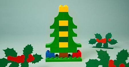 Θα χρειαστείτε: πράσινα και κίτρινα τουβλάκια για το δέντρο, ένα καφέ τουβλάκι για τον κορμό και ένα κόκκινο & μπλε για τα δωράκια κάτω από το δέντρο.